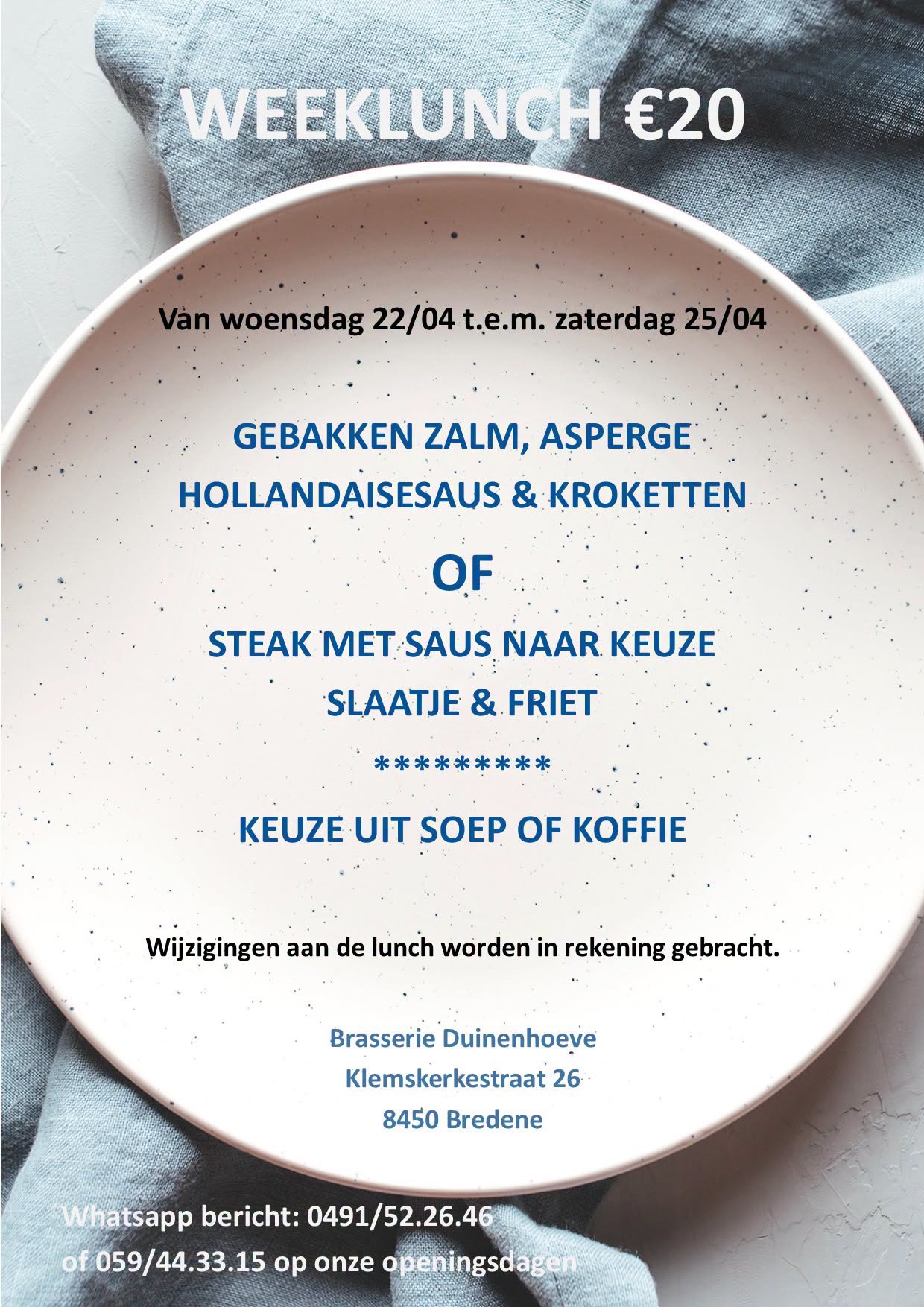 Zeker zijn dat uw reservatie goed aangekomen is? Dan belt u ons best op het nummer 059/443315. We zijn van woensdag t.e.m. zondag steeds bereikbaar vanaf 10u tot sluitingstijd. Wegens drukte is het niet altijd mogelijk om direct op berichten te antwoorden. Geen bevestiging is geen reservatie.