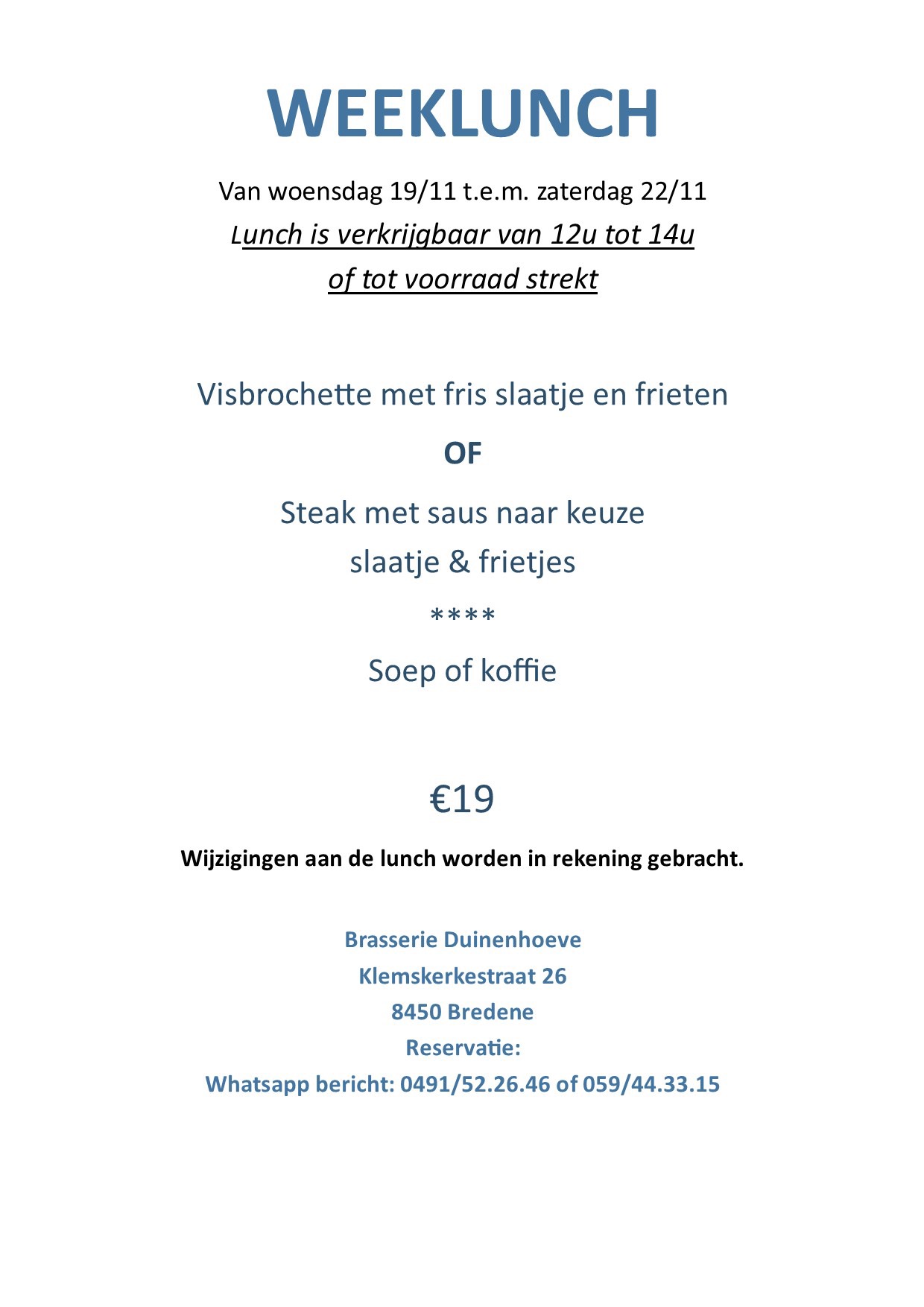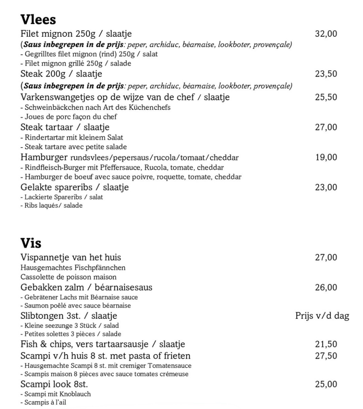Verras uzelf met onze traditionele Belgisch/Franse keuken. Wij bieden elke week een nieuwe weeklunch aan, waaruit u telkens dagverse vis of onze malse steak kan kiezen. Ook hebben we maandelijks een nieuwe menu beschikbaar en natuurlijk ook verschillende gerechten die u aan de kaart kan verkrijgen. Van aperitief tot dessert, we maken er een heerlijke belevenis van!